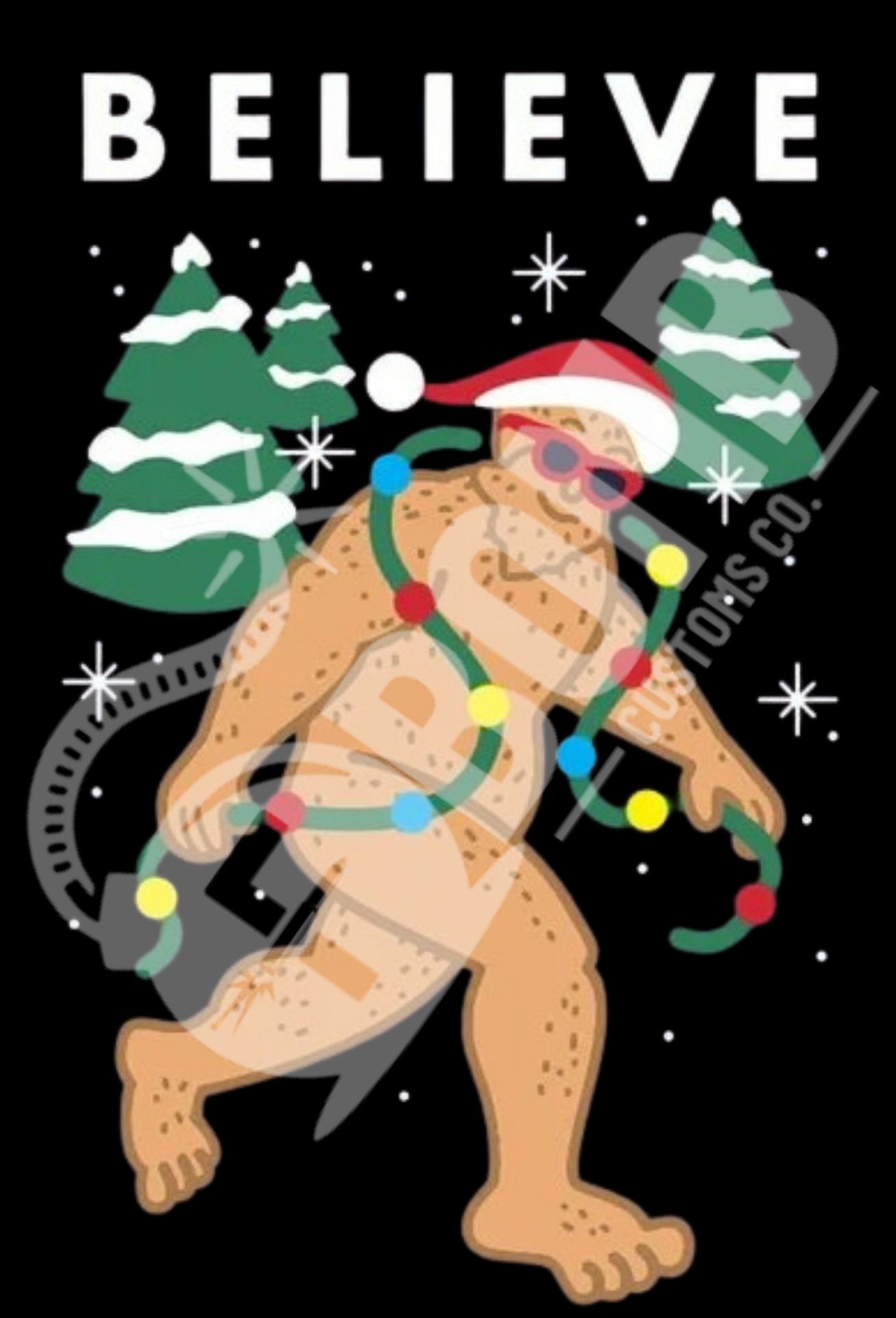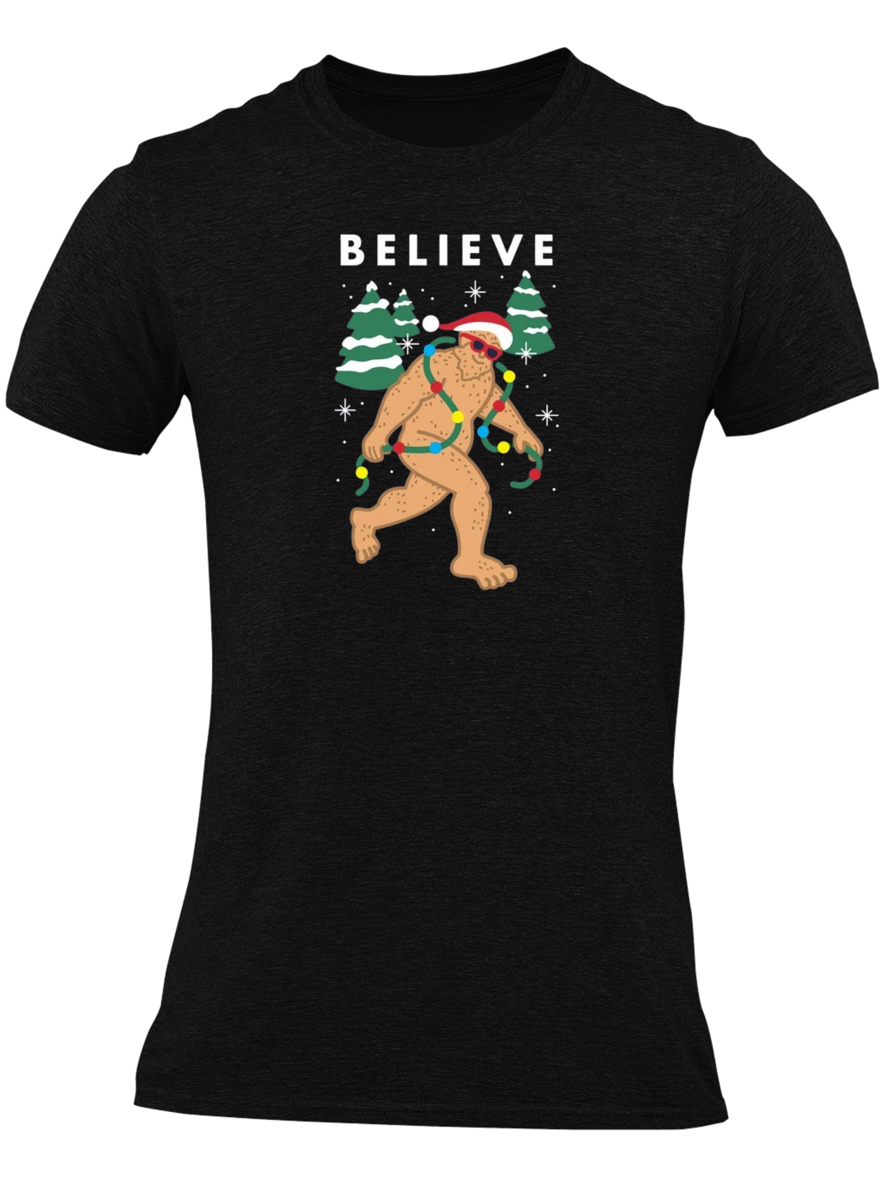 For the believer who knows Bigfoot didn’t vanish… he just dipped out of society to vibe through December wrapped in discount Christmas lights. This features the most confident holiday cryptid ever spotted serving festive drip, rocking a Santa hat like he owns the forest, and strutting like he’s late to a secret elf afterparty. Wear it when you want people to believe… not in folklore, but in your ability to outshine everyone’s ugly sweater energy by at least 10,000 lumens.