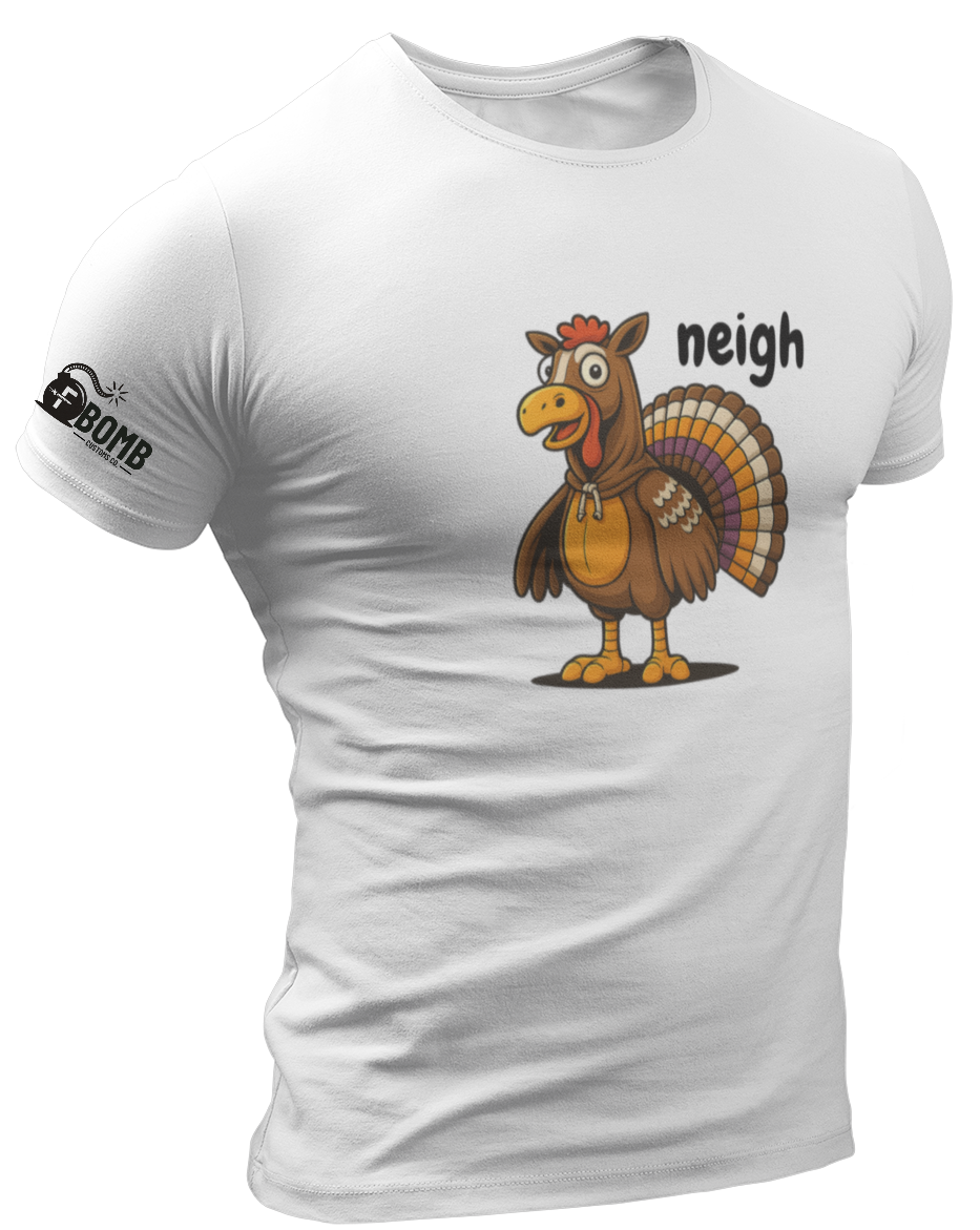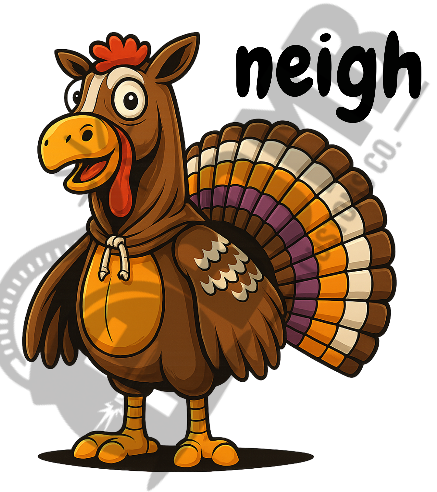This turkey’s playing 4D chess while the rest are getting basted. He slapped on a fake mane, learned one horse sound, and said, “Neigh, pilgrims!” hoping nobody notices the drumsticks. Wear this and honor the bravest bird of Thanksgiving, the one smart enough to rebrand as livestock. Perfect for anyone who’s ever dodged responsibility with confidence and people who appreciate dumb genius energy because when survival’s on the line… it’s neigh or never.