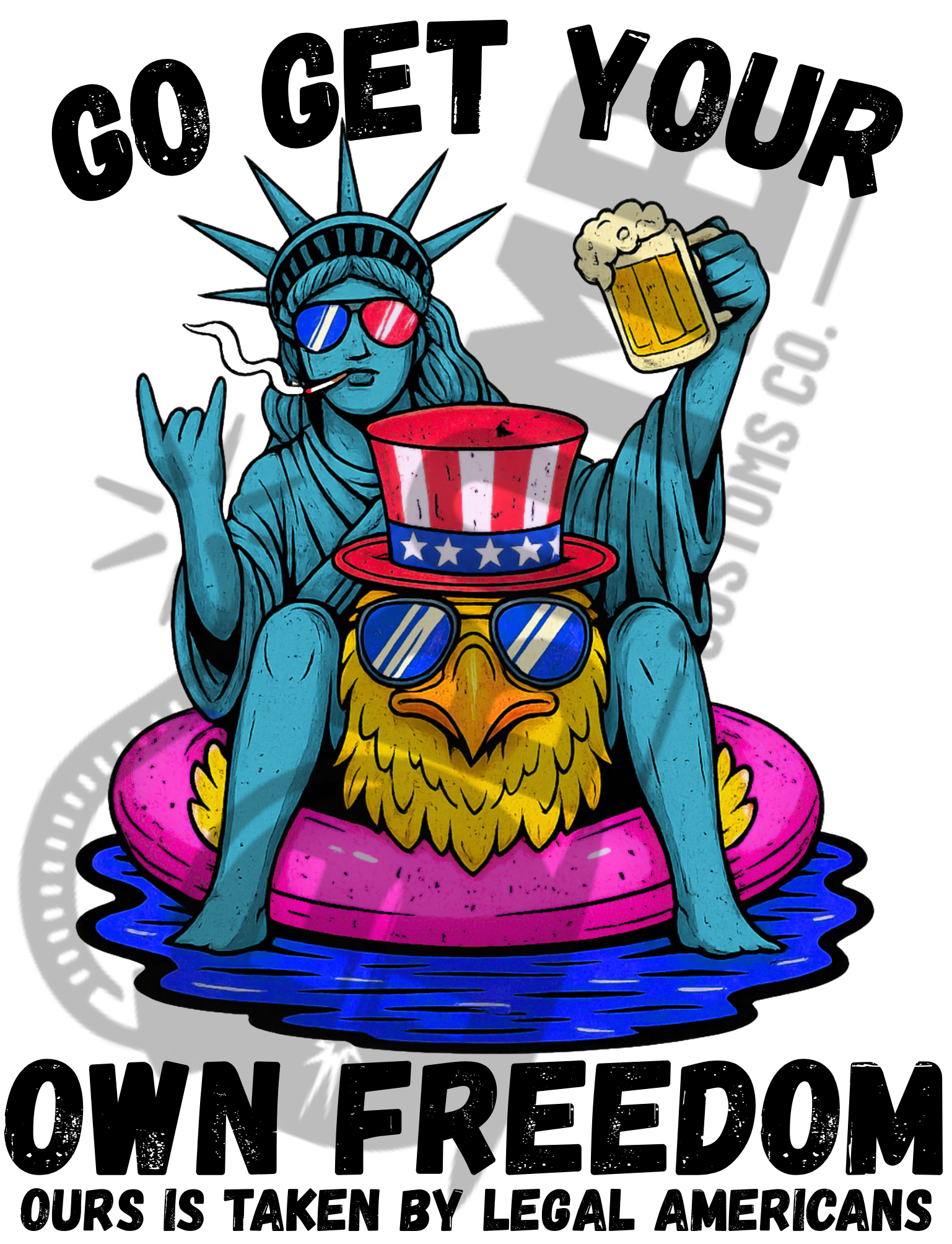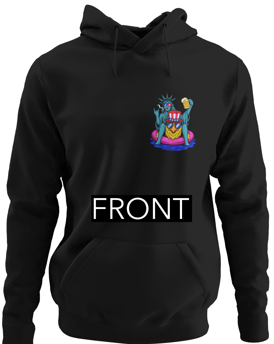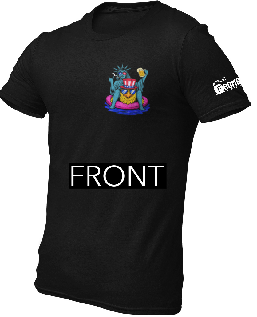 Listen up, freedom enthusiast. This is a wearable Declaration of Independence dipped in beer foam and wrapped in bald eagle feathers. On the back, you’ve got Lady Liberty herself, chilling in shades, throwing up the rock-on sign, and sipping a frosty brew while floating on a neon eagle pool toy. Why? Because freedom doesn’t ask why, it asks where’s the cooler? Put it on, crack a cold one, and let America know: freedom’s taken, buddy. Go get your own.